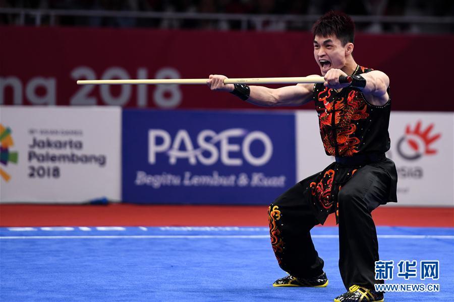 ↑8月21日,中国澳门选手黄俊华在比赛中。 当日,在第18届亚运会武术男子南拳南棍全能比赛中,中国澳门选手黄俊华获得冠军。 新华社记者张金加摄