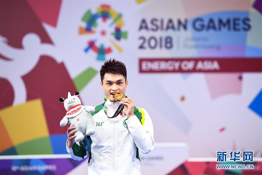 ↑8月21日,中国澳门选手黄俊华在颁奖仪式上。 当日,在第18届亚运会武术男子南拳南棍全能比赛中,中国澳门选手黄俊华获得冠军。 新华社记者张金加摄
