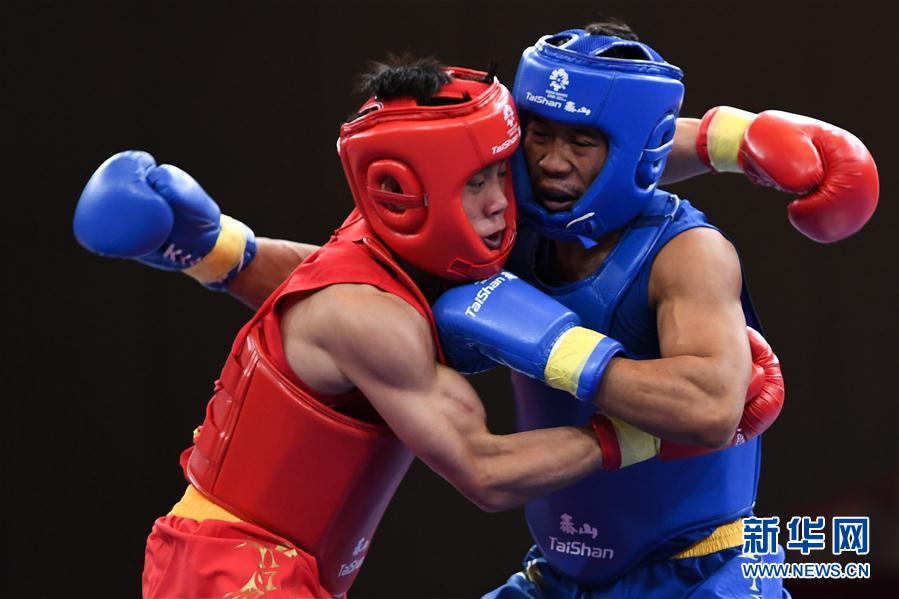 8月22日,中国选手申国顺(左)在比赛中。当日,在第18届亚运会男子散打56公斤以下半决赛中, 中国选手申国顺胜印度尼西亚选手优素福,进入决赛。 新华社记者张金加摄
