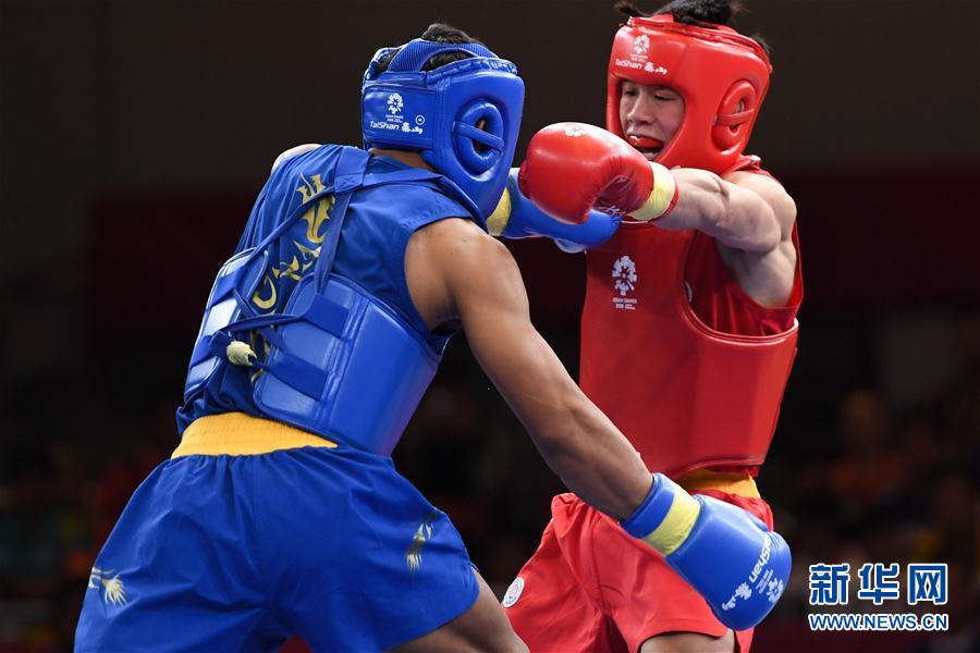 8月22日,中国选手申国顺(右)在比赛中。当日,在第18届亚运会男子散打56公斤以下半决赛中, 中国选手申国顺胜印度尼西亚选手优素福,进入决赛。 新华社记者张金加摄