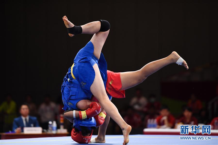 8月22日,中国选手蔡颖颖(前)在比赛中 。 当日,在第18届亚运会女子散打60公斤以下半决赛中, 中国选手蔡颖颖战胜印度选手德维,进入决赛。 新华社记者张金加摄