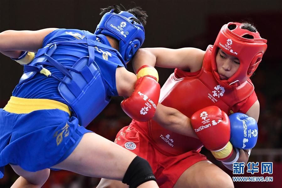 8月22日,中国选手蔡颖颖(左)在比赛中 。 当日,在第18届亚运会女子散打60公斤以下半决赛中, 中国选手蔡颖颖战胜印度选手德维,进入决赛。 新华社记者张金加摄