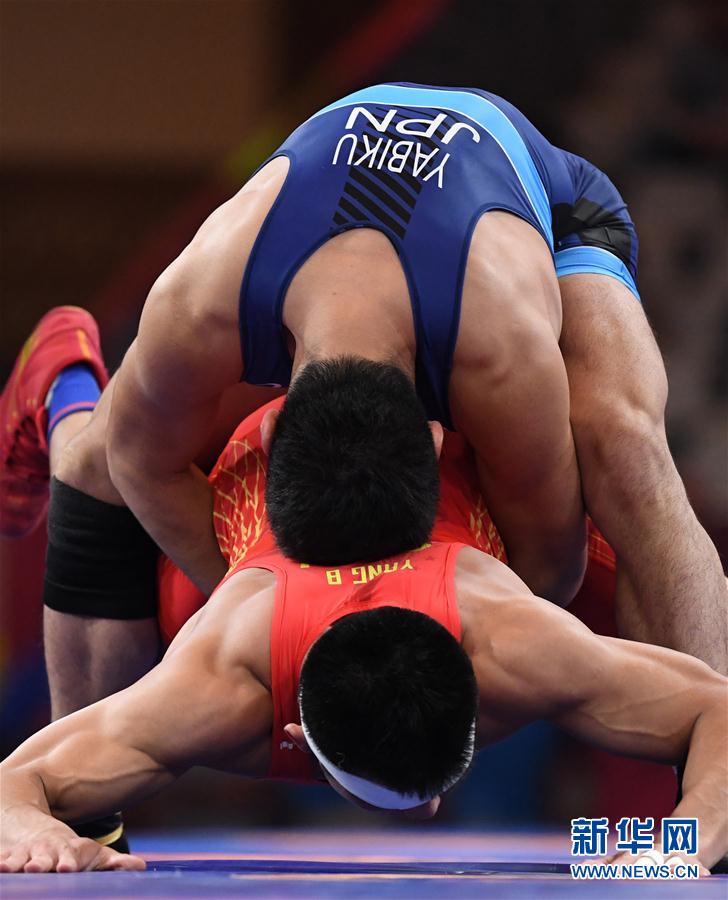8月22日,中国选手杨斌(下)在比赛中。 当日,在第18届亚运会摔跤男子古典式77公斤级铜牌争夺赛中,中国选手杨斌战胜日本选手获铜牌。 新华社记者李贺摄