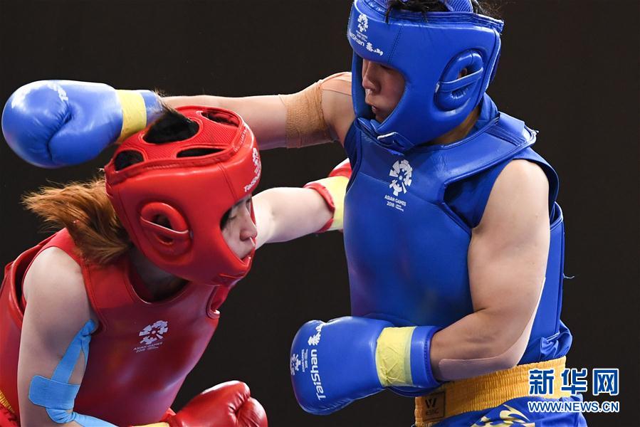 8月22日,中国选手李玥瑶(右)在比赛中。 当日,在第18届亚运会女子散打52公斤级半决赛中,中国选手李玥瑶战胜中国台北选手。 新华社记者张金加摄