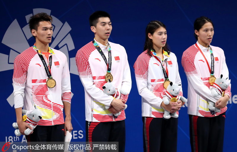 人民网北京8月22日电(管若寒 实习生邓方佳) 北京时间8月22日晚,2018雅加达亚运会男女4100米混合泳接力决赛,以徐嘉余、闫子贝、张雨霏、朱梦慧组成的中国队以3分40秒45的成绩夺得金牌,并且打破了亚洲纪录。
