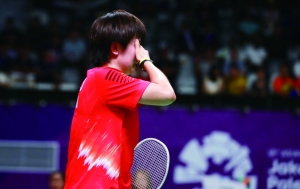 昨天进行的亚运会羽毛球女子团体比赛,中国队在陈雨菲首战获胜的情况下,此后三场连遭败仗,决赛1比3不敌日本队。图为何冰娇情绪沮丧。