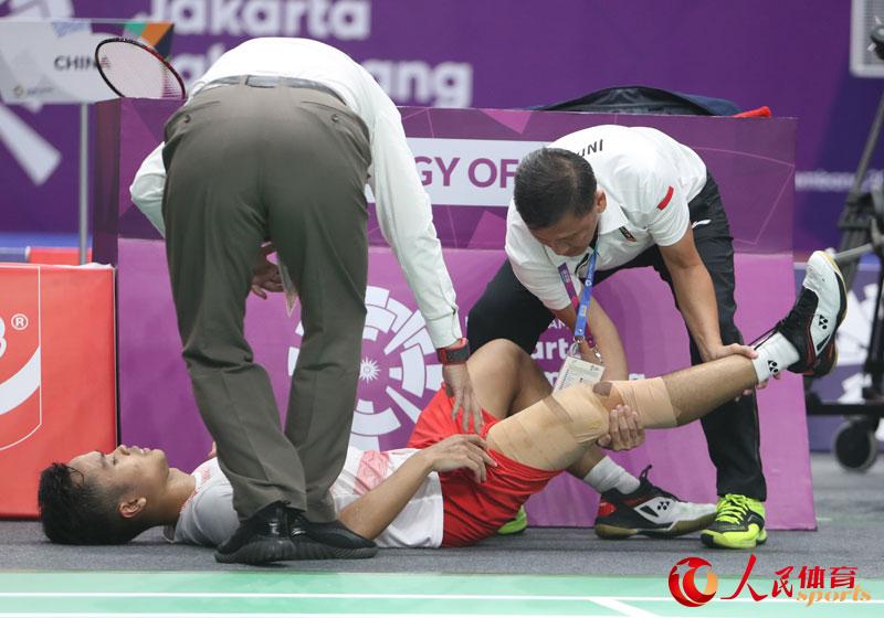 金廷大腿抽筋(人民网记者 赵欣悦 摄)