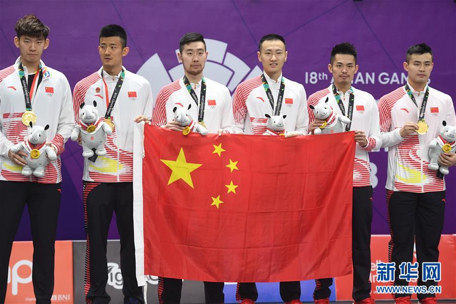 ↑ 8月22日,中国队球员在颁奖仪式上。 当日,在第18届亚运会羽毛球男子团体决赛中,中国队以3比1战胜印度尼西亚队,获得金牌。 新华社记者杜宇摄