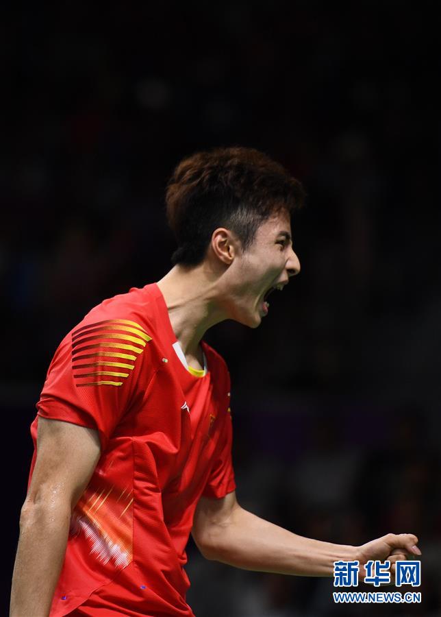 ↑8月22日,中国队球员谌龙在比赛中庆祝。 当日,在第18届亚运会羽毛球男子团体决赛中,中国队迎战印度尼西亚队。 新华社记者李响摄