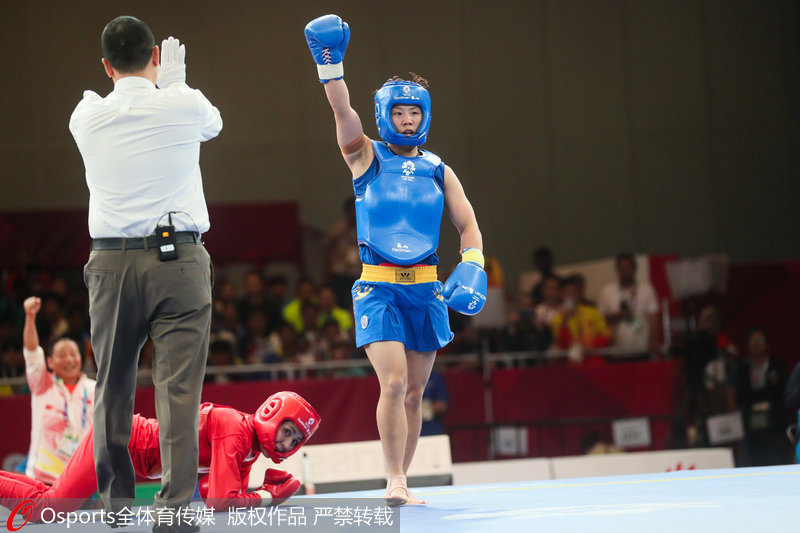 人民网北京8月23日电(李乃妍 实习生陈呈)北京时间今日,雅加达亚运会女子武术散打52公斤级决赛中,李玥瑶夺魁,为中国代表团再添一枚金牌。(Osports全体育传媒专供人民体育 版权作品 严禁转载)