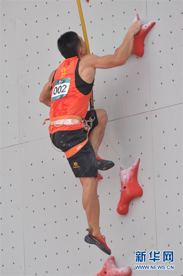 8月23日,钟齐鑫在比赛中。 当日,在第18届亚运会攀岩男子速度个人赛决赛中,中国选手钟齐鑫获得银牌。 新华社发(韦里摄)