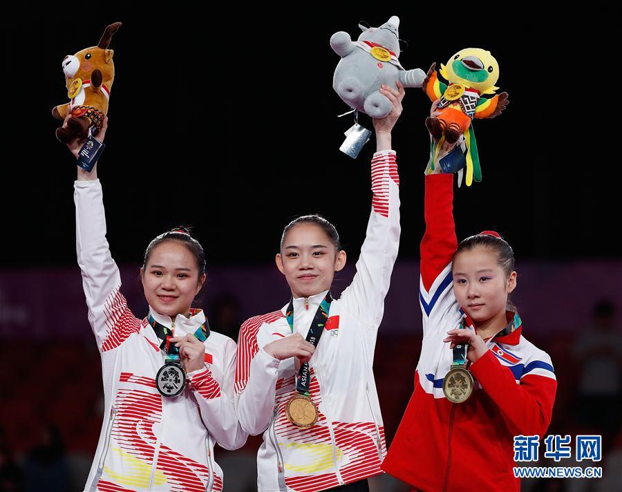 8月23日,中国选手刘婷婷(中)、罗欢(左)与朝鲜选手全蔷薇在女子高低杠颁奖仪式上合影。 当日,在印度尼西亚雅加达举行的第18届亚运会体操女子高低杠决赛中,中国选手刘婷婷获得金牌,中国选手罗欢获得银牌,朝鲜选手全蔷薇获得铜牌。 新华社记者王丽莉摄