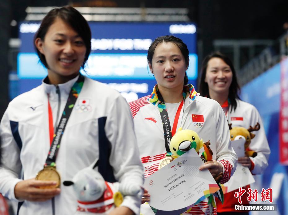当地时间8月23日,在第18届亚运会女子50米蛙泳决赛中,中国选手冯君阳获得季军。 中新社记者 刘关关 摄