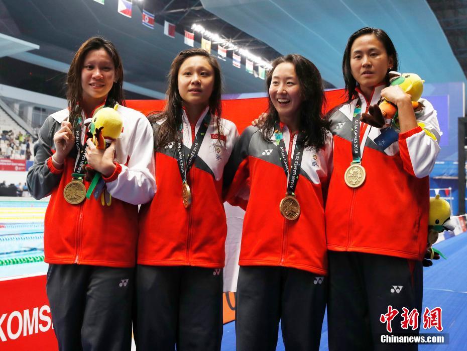 当地时间8月23日,在第18届亚运会女子4x100米混合接力决赛中,新加坡队获得季军。 中新社记者 刘关关 摄