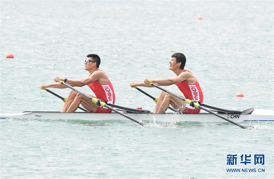 ↑8月23日,张志远(右)、陈森森在比赛中。 当日,在第18届亚运会赛艇男子双人双桨决赛中,中国选手张志远、陈森森以6分48秒65的成绩获得亚军。 新华社记者程敏摄