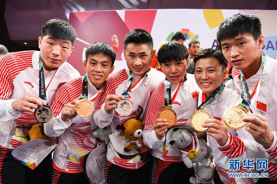 8月23日,中国散打运动员师战卫、申国顺、王雪涛、蔡颖颖、李玥瑶、李勐凡(从左到右)在颁奖仪式后合影。 新华社记者张金加摄
