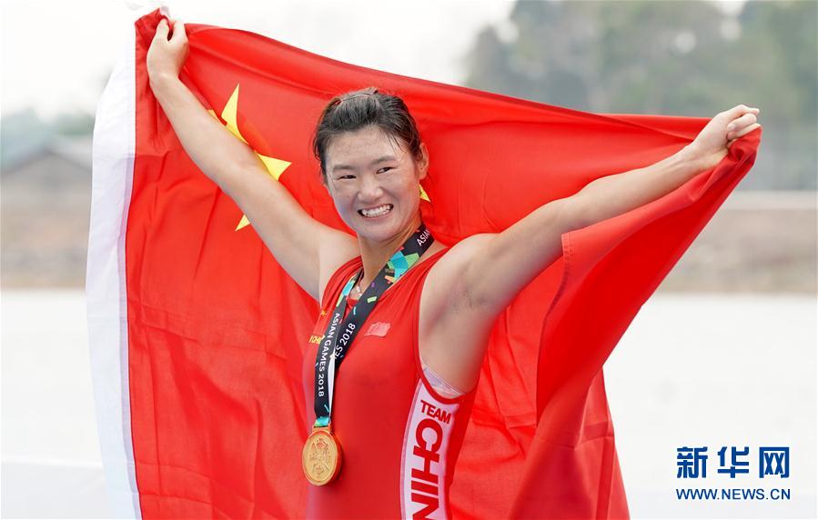 8月23日,陈云霞身披国旗庆祝。 当日,在第18届亚运会赛艇女子单人双桨比赛中,中国选手陈云霞以8分08秒21的成绩获得冠军。 新华社记者程敏摄