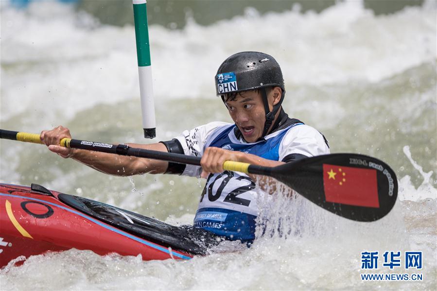 8月23日,中国选手全鑫在比赛中。 当日,在第18届亚运会皮划艇激流回旋男子单人皮艇比赛中,中国选手全鑫获得金牌。日本选手足立和也获得银牌,泰国选手赫尔曼获得铜牌。 新华社记者吴壮摄