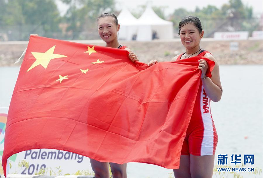 8月23日,巨蕊(右)、林心玉在领奖台上。 当日,在第18届亚运会赛艇女子双人单桨决赛中,中国选手巨蕊、林心玉以7分55秒50的成绩获得冠军。 新华社记者程敏摄