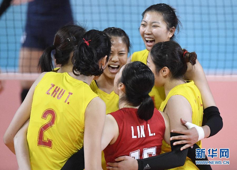 8月23日,中国队球员在比赛中庆祝得分。当日,在第18届亚运会女子排球B组小组赛中,中国队3-0战胜韩国队。新华社记者黄宗治摄