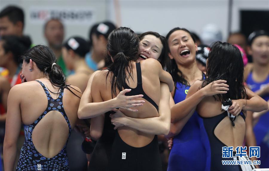8月23日,中国香港队队员和新加坡队队员在裁判改判后庆祝。 当日,在第18届亚运会女子4X100米混合泳接力决赛中,日本队获得冠军。中国队和韩国队由于犯规被取消成绩,中国香港队获得亚军,新加坡队获得季军。 新华社记者费茂华摄