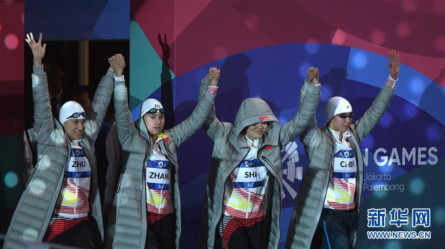 8月23日,中国队队员在赛前入场。 当日,在第18届亚运会女子4X100米混合泳接力决赛中,日本队获得冠军。中国队和韩国队由于犯规被取消成绩,中国香港队获得亚军,新加坡队获得季军。 新华社记者潘昱龙摄