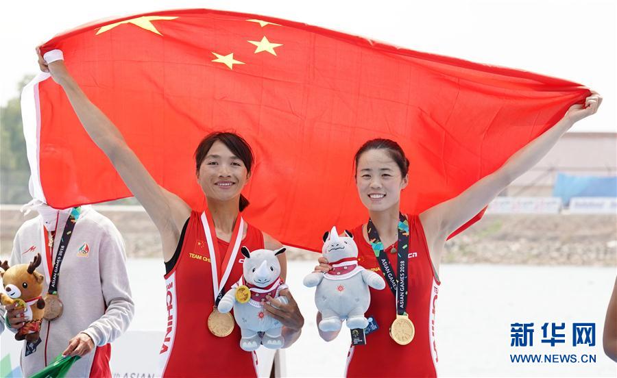 8月24日,中国选手梁国汝(左)、吴强在颁奖仪式上。 当日,在第18届亚运会赛艇女子轻量级双人双桨决赛中,中国选手梁国汝、吴强以7分40秒24的成绩获得冠军。 新华社记者程敏摄