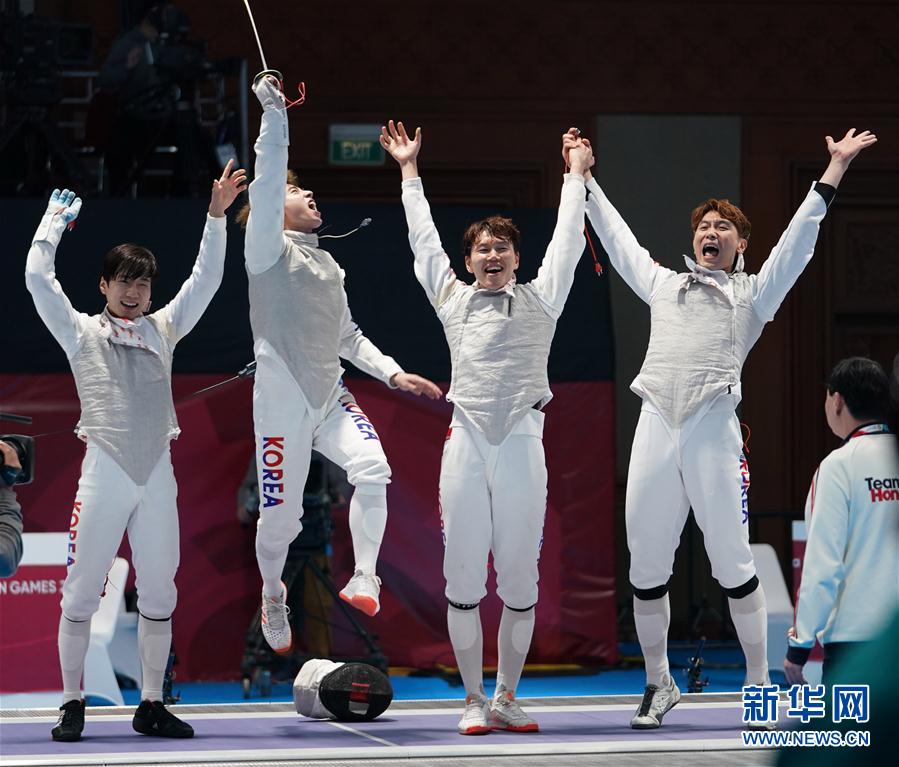 8月24日,韩国队选手庆祝胜利。当日,在第18届亚运会男子花剑团体决赛中,韩国队以45比37战胜中国香港队,获得冠军。 新华社记者王毓国摄