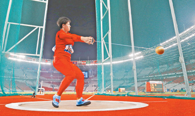 8月25日,中国队选手罗娜在比赛中。当日,在女子链球决赛中,罗娜以71米42的成绩夺冠,队友王峥获得亚军。