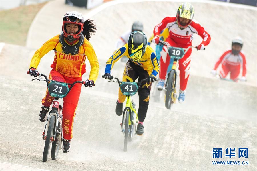 8月25日,中国选手张娅儒(左一)在比赛中。 当日,在第18届亚运会女子BMX小轮车比赛中,中国选手张娅儒以39秒643的成绩夺冠。 新华社记者张金加摄