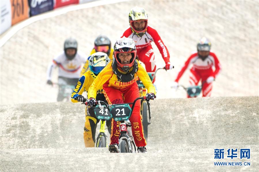8月25日,中国选手张娅儒(前)在比赛中。 当日,在第18届亚运会女子BMX小轮车比赛中,中国选手张娅儒以39秒643的成绩夺冠。 新华社记者张金加摄