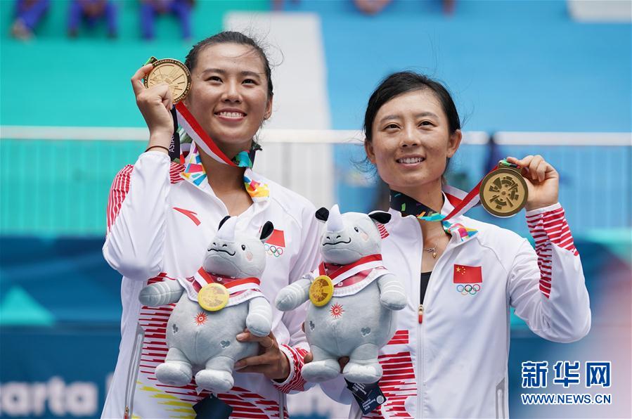 8月25日,徐一璠/杨钊煊(左)在领奖台上。 当日,在第18届亚运会网球女双决赛中,中国队选手徐一璠/杨钊煊以2比1战胜中国台北队选手詹皓晴/詹咏然,夺得冠军。 新华社记者程敏摄
