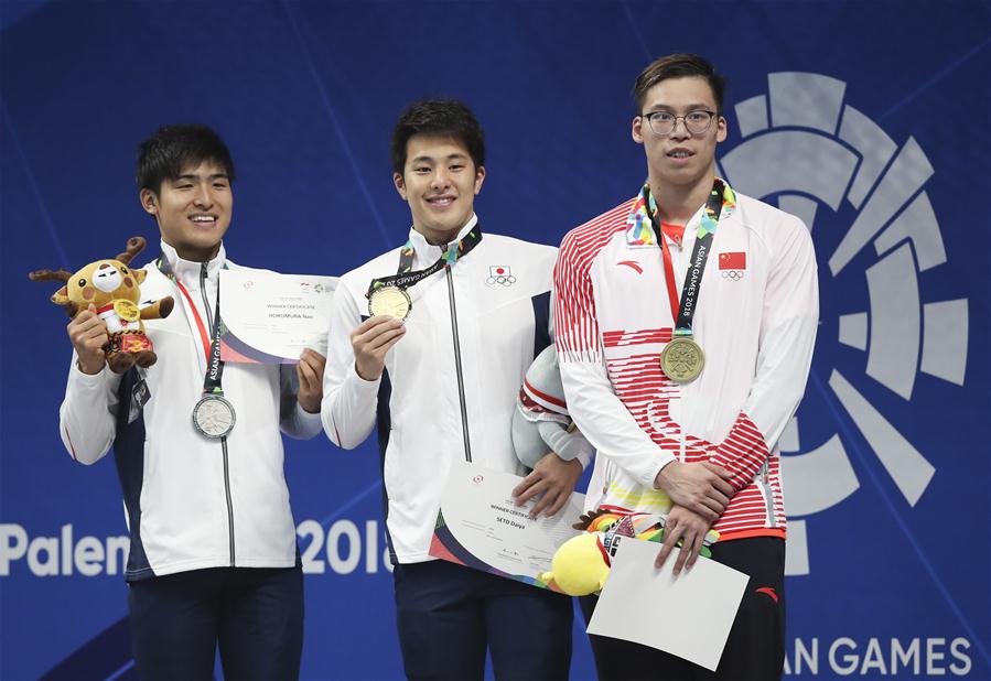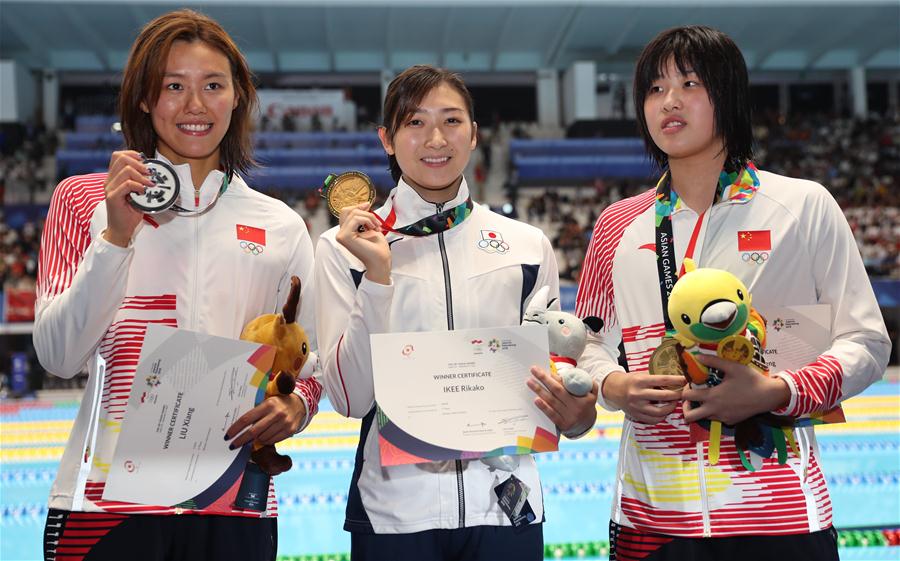8月24日,冠军日本选手池江璃花子(中)、亚军中国选手刘湘(左)和季军中国选手吴卿风在颁奖仪式后展示奖牌。 当日,在第18届亚运会女子50米自由泳决赛中,日本选手池江璃花子以24秒53的成绩夺冠,中国选手刘湘以24秒60的成绩获得亚军,中国选手吴卿风以24秒87的成绩获得季军。 新华社记者费茂华摄