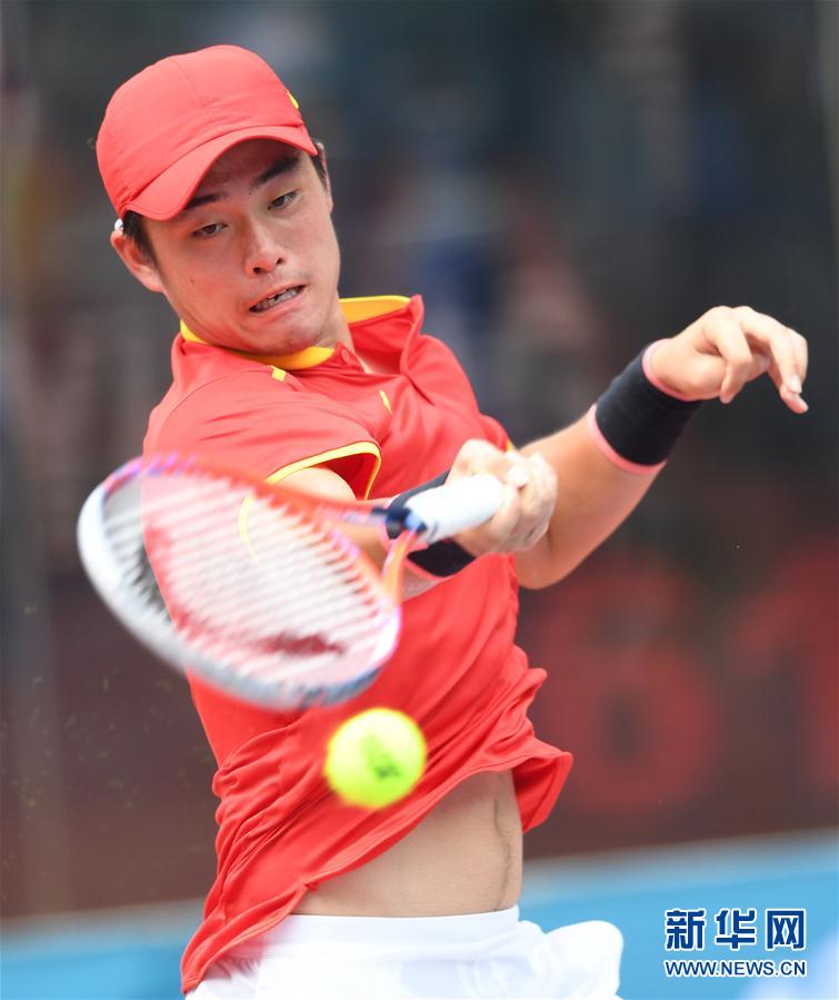 8月25日,中国队员吴易昺在比赛中。 当日,在第18届亚运会网球男子单打决赛中,中国选手吴易昺以1比2负于乌兹别克斯坦名将伊斯托明,获得亚军。 新华社记者程敏摄