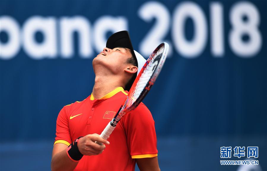 8月25日,中国队员吴易昺在比赛中。 当日,在第18届亚运会网球男子单打决赛中,中国选手吴易昺以1比2负于乌兹别克斯坦名将伊斯托明,获得亚军。 新华社记者程敏摄
