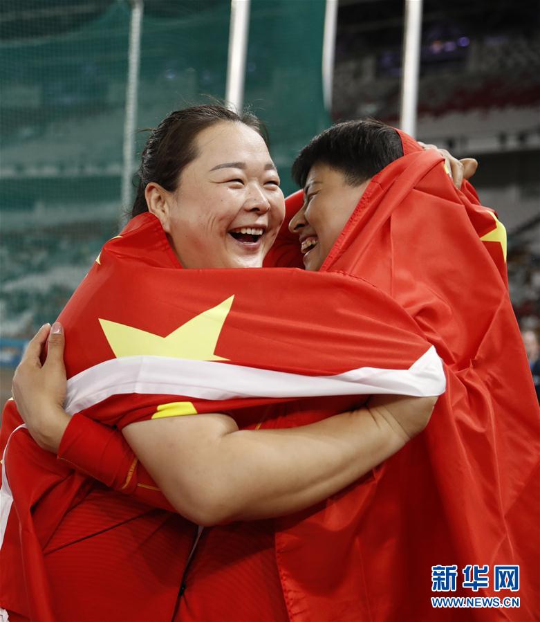 8月25日,中国选手罗娜(右)和王峥在赛后庆祝。 当日,在第18届亚运会田径女子链球决赛中,中国选手罗娜以71米42的成绩夺冠,中国选手王峥以70米86的成绩获得亚军。 新华社记者王丽莉摄