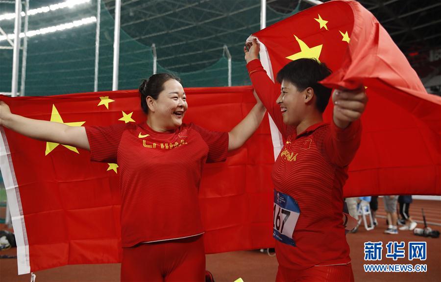 8月25日,中国选手罗娜(右)和王峥在赛后庆祝。 当日,在第18届亚运会田径女子链球决赛中,中国选手罗娜以71米42的成绩夺冠,中国选手王峥以70米86的成绩获得亚军。 新华社记者王丽莉摄