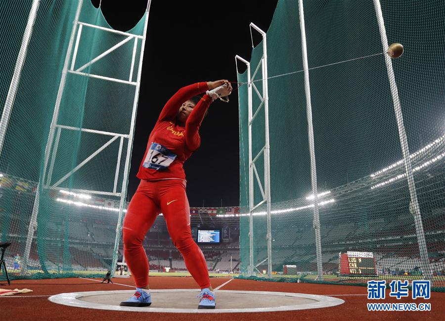 8月25日,中国选手罗娜在比赛中。 当日,在第18届亚运会田径女子链球决赛中,中国选手罗娜以71米42的成绩夺冠。 新华社记者王丽莉摄