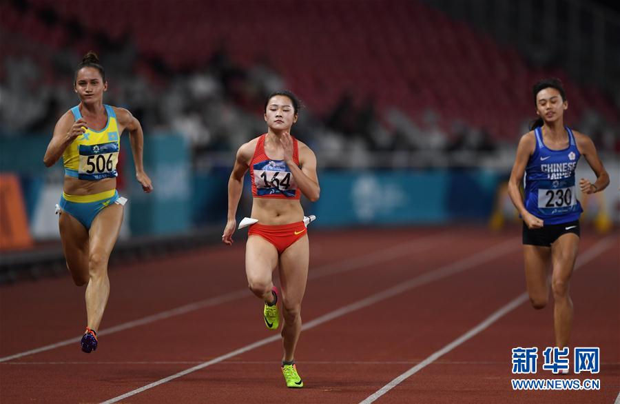 8月25日,中国选手梁小静(中)在比赛中。 当日,在第18届亚运会田径女子100米预赛中,中国选手梁小静以11秒46的成绩晋级。 新华社记者潘昱龙摄