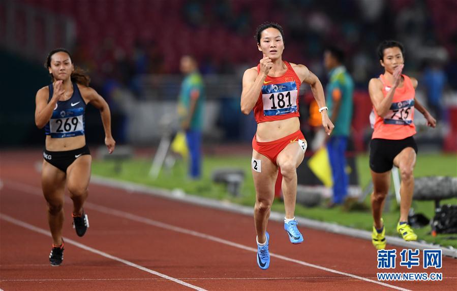 8月25日,中国选手韦永丽(中)在比赛中。 当日,在第18届亚运会田径女子100米预赛中,中国选手韦永丽以11秒32的成绩晋级。 新华社记者潘昱龙摄