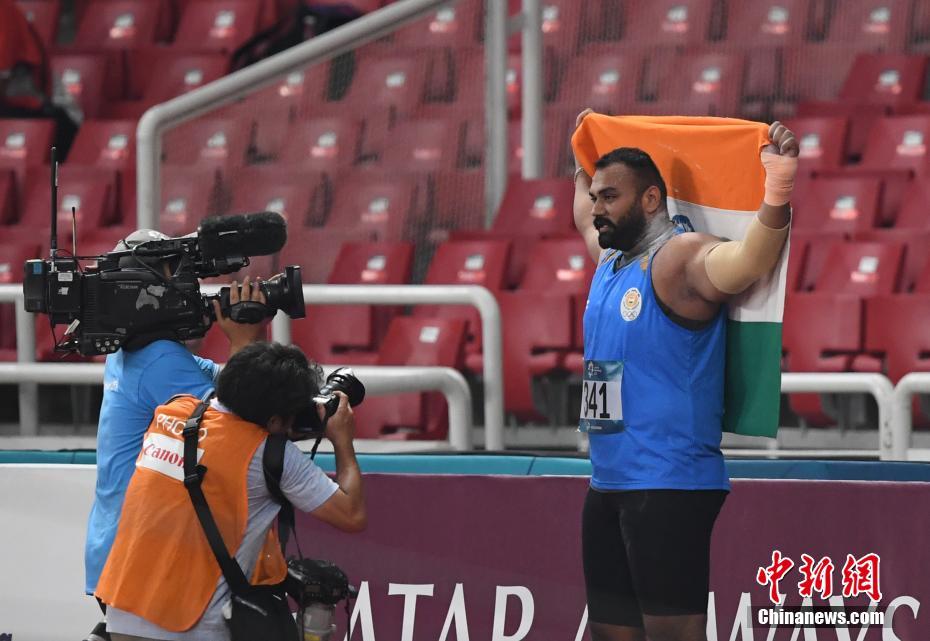 8月25日晚间,雅加达亚运会男子铅球决赛举行,印度选手Tajinderpal Singh Toor以20.75米的新亚运会纪录夺得冠军。图为印度选手Toor庆祝胜利。中新社记者 侯宇 摄