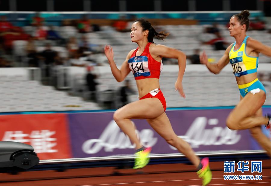 8月25日,中国选手梁小静(左)在比赛中。 当日,在第18届亚运会田径女子100米预赛中,中国选手梁小静以11秒46的成绩晋级。 新华社记者王丽莉摄