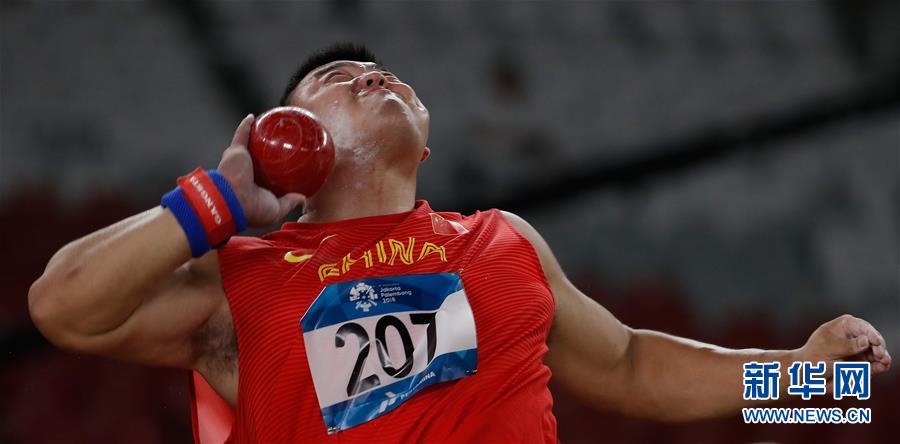 8月25日,中国选手刘洋在比赛中。 当日,在第18届亚运会田径男子铅球决赛中,中国选手刘洋以19米52的成绩获得亚军。 新华社记者王丽莉摄