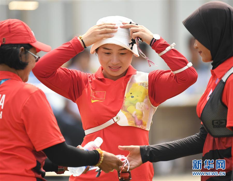 8月28日,中国选手张心妍(中)在比赛中。 当日,在第18届亚运会女子个人反曲弓决赛中,中国选手张心妍战胜印尼选手蒂安纳达夺得金牌。 新华社记者李贺摄