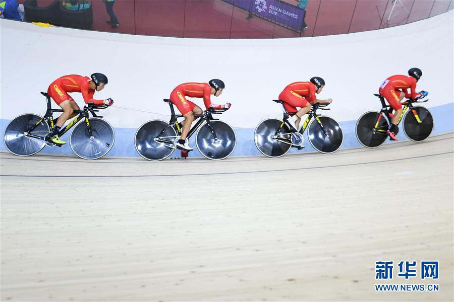 8月28日,中国队在比赛中。 当日,在第18届亚运会场地自行车男子团体追逐赛决赛中,中国队获得冠军,中国香港队获得亚军。 新华社记者杜宇摄