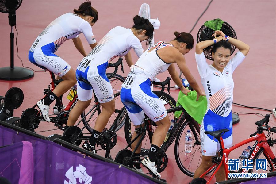 8月28日,韩国队在比赛后。 当日,在第18届亚运会场地自行车女子团体追逐赛决赛中,韩国队获得冠军,中国队获得亚军。 新华社记者杜宇摄