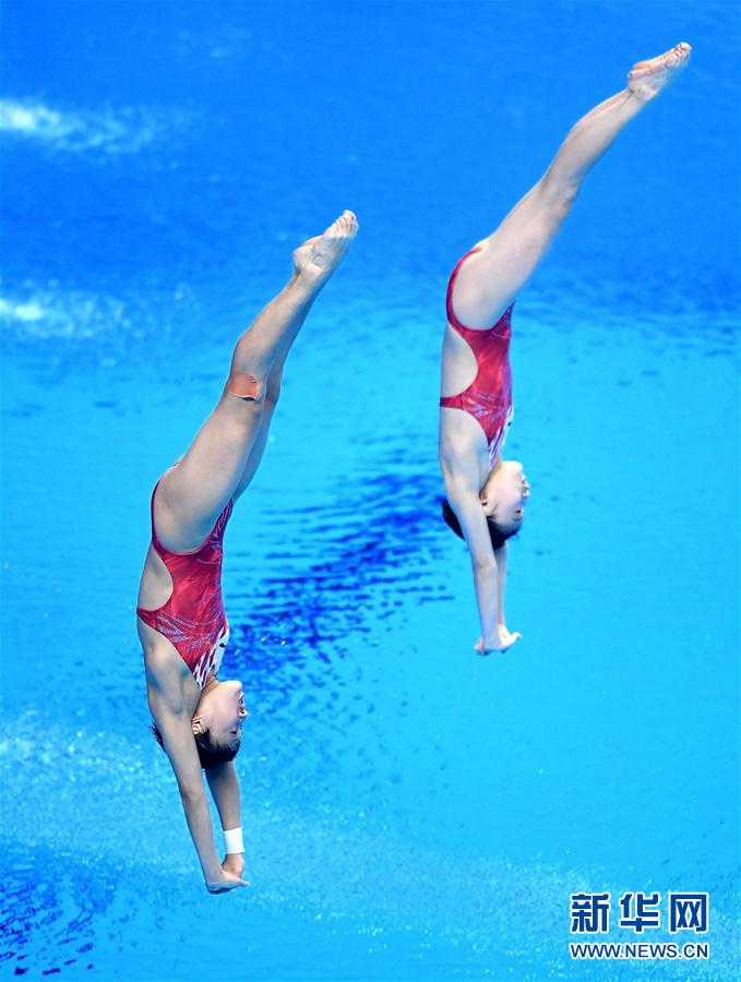 8月28日,中国选手张家齐/掌敏洁在比赛中。 当日,在第18届亚运会跳水女子双人10米跳台决赛中,中国选手张家齐/掌敏洁以361.38分的成绩夺冠。 新华社记者岳月伟摄