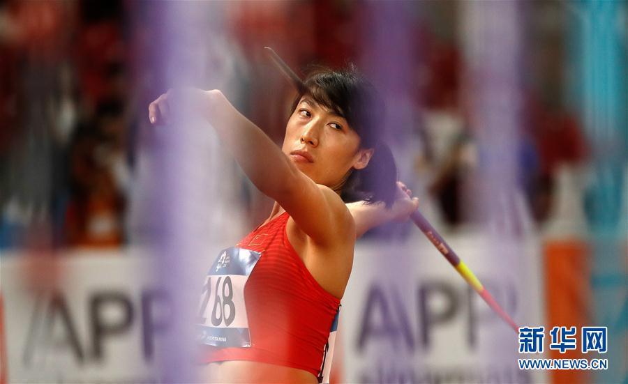 ↑8月28日,中国选手吕会会在比赛中。 当日,在第18届亚运会女子标枪决赛中,中国选手吕会会以63米16的成绩获得亚军。 新华社记者王丽莉摄