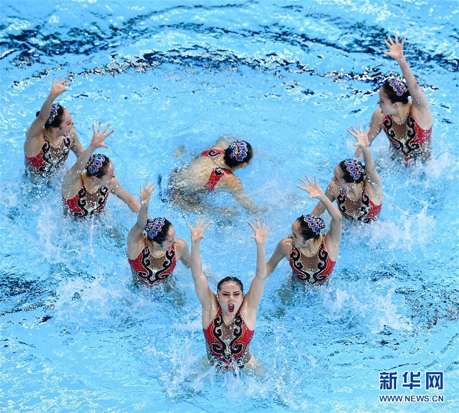 8月29日,中国队选手在女子集体自由自选比赛中。 当日,在第18届亚运会花样游泳集体项目中,中国队以186.9395分的成绩获得冠军。 新华社记者李响摄