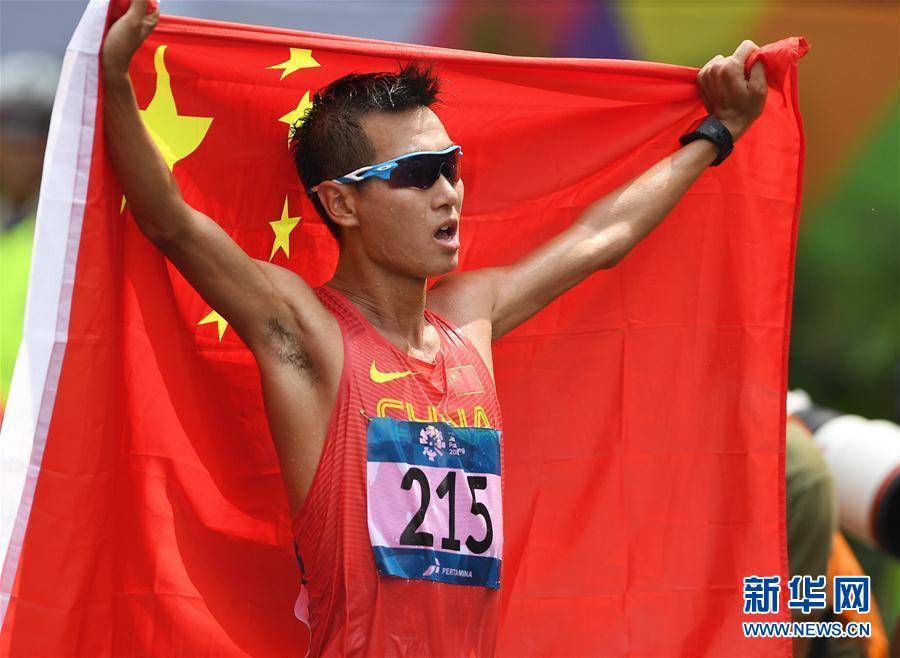 8月30日,中国选手王钦在赛后庆祝。 当日,第18届亚运会男子50公里竞走比赛在雅加达举行,日本选手藤木隼人夺冠,中国选手王钦获得亚军。 新华社记者李贺摄